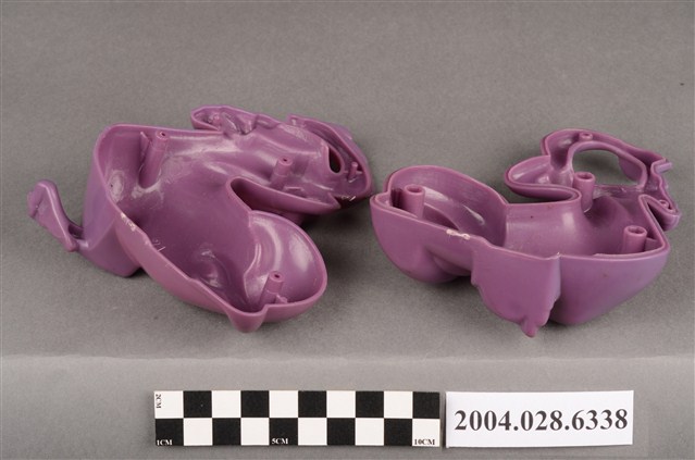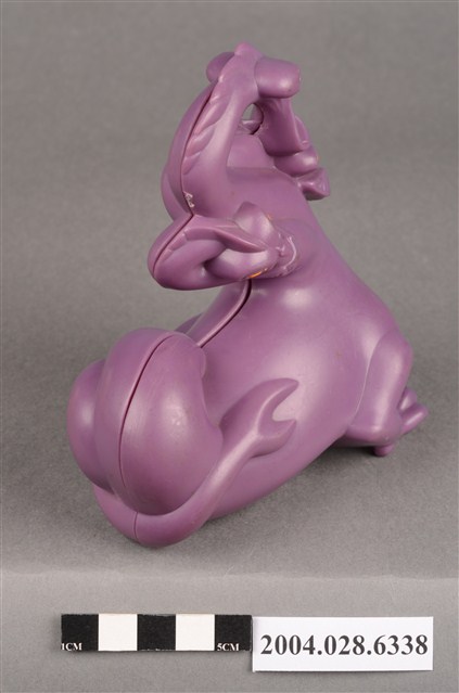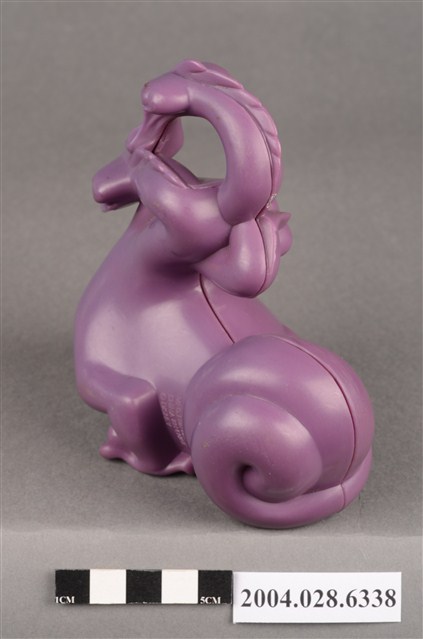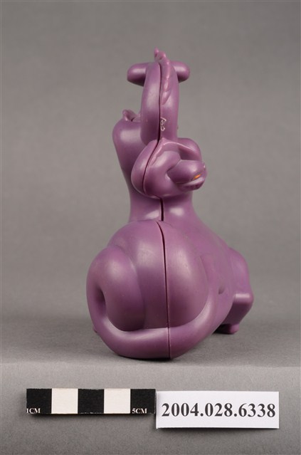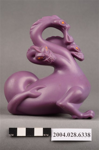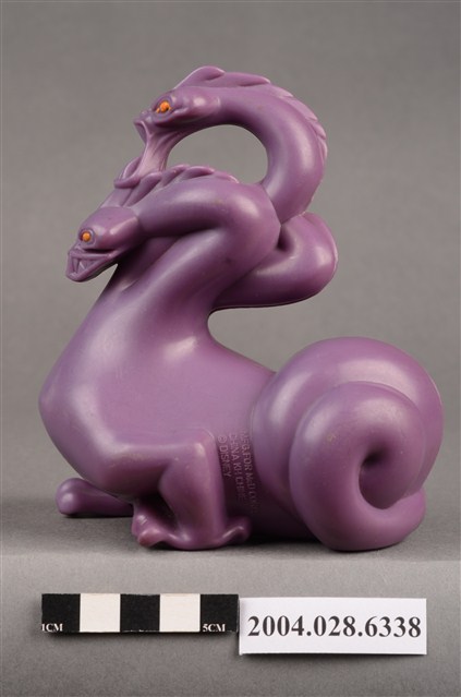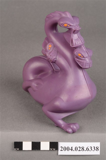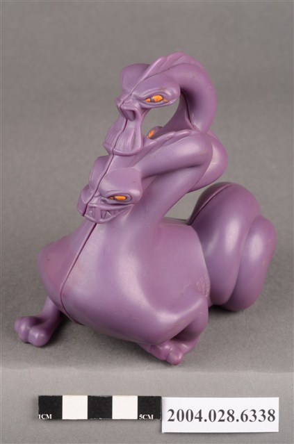 1.本物件為速食餐廳麥當勞玩具,塑膠材質。該物件乃麥當勞大力士三頭龍之塑膠玩具,主要配色為紫色。其具有三個頭、兩隻腳,其尾巴盤據呈蜷曲狀。其側面可見「MFG. FOR McD CORP.」、「CHINA KH CHINE」、「DISNEY」字樣。