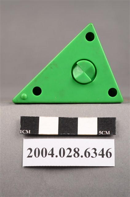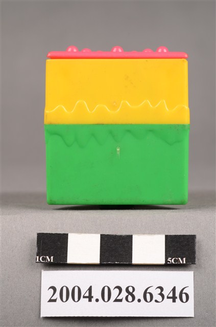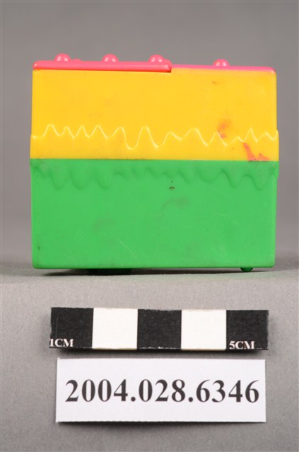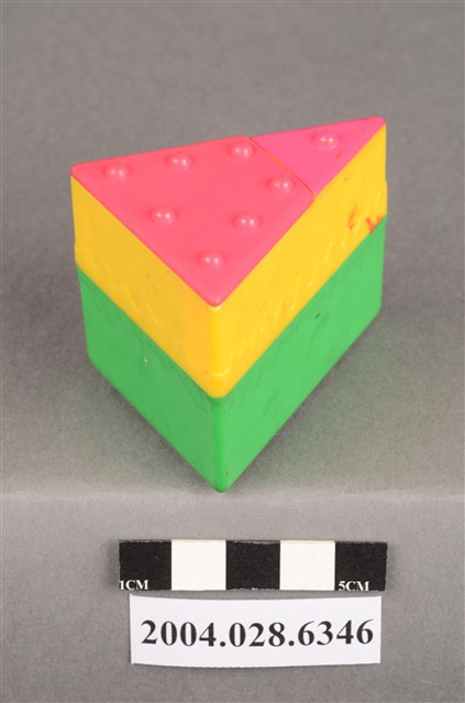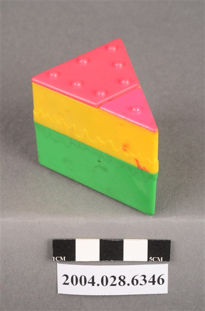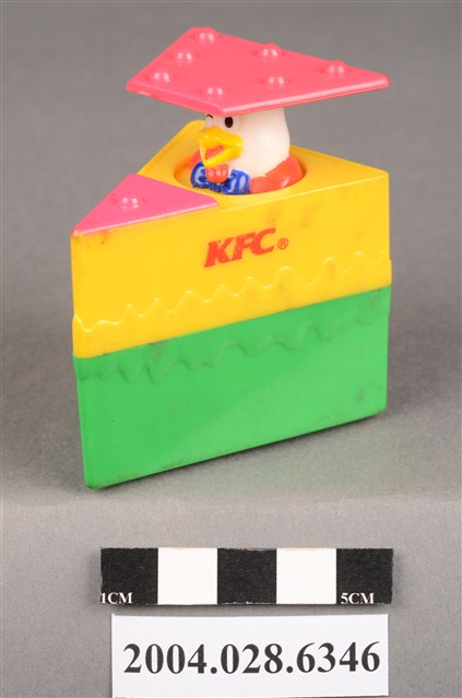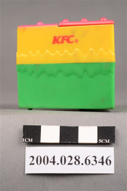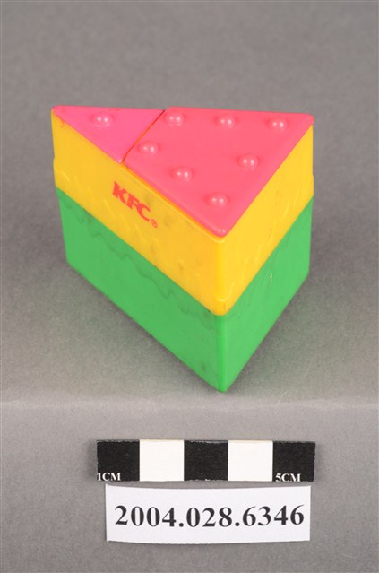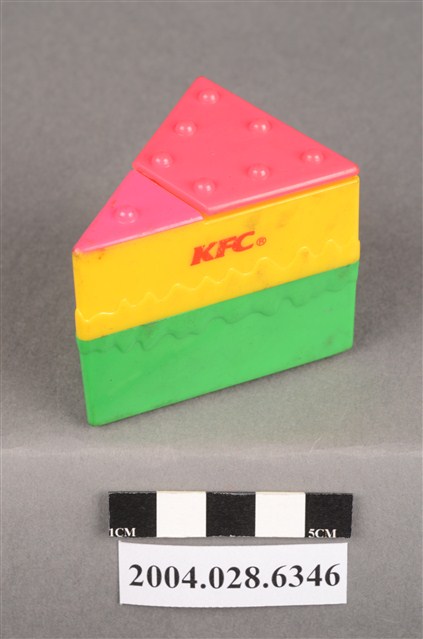 1.本物件為速食餐廳肯德基玩具,塑膠材質。該物件乃肯德基奇奇雞蛋糕之塑膠玩具,主要配色為綠、黃、紅色。該玩具外觀為三角體,由底部至上層,依序為綠、黃、紅色,黃色部分可見「KFC」字樣。頂層設有機關,可見玩具內部有一隻玩具雞。