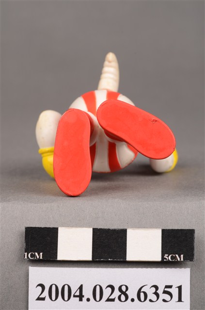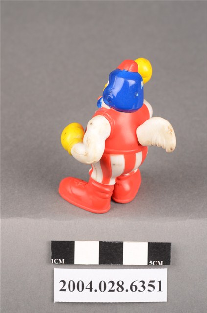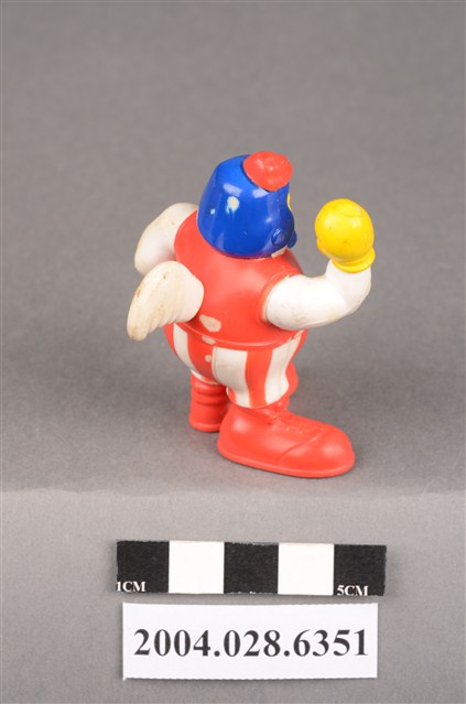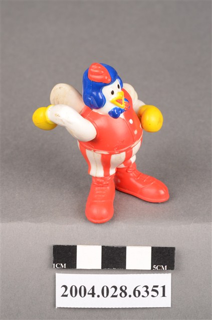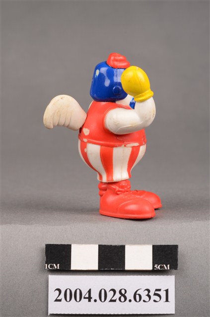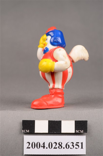 1.本物件為速食餐廳肯德基玩具,塑膠材質。該物件乃肯德基奇奇雞之塑膠玩具,主要配色為白、紅、藍色。該玩具外觀為一隻頭戴藍色帽子的雞,身著紅色背心、紅白條紋短褲,脖子繫有藍色領結,雙手佩戴黃色手套。