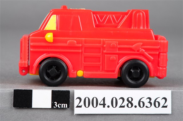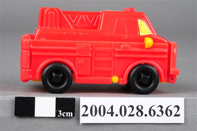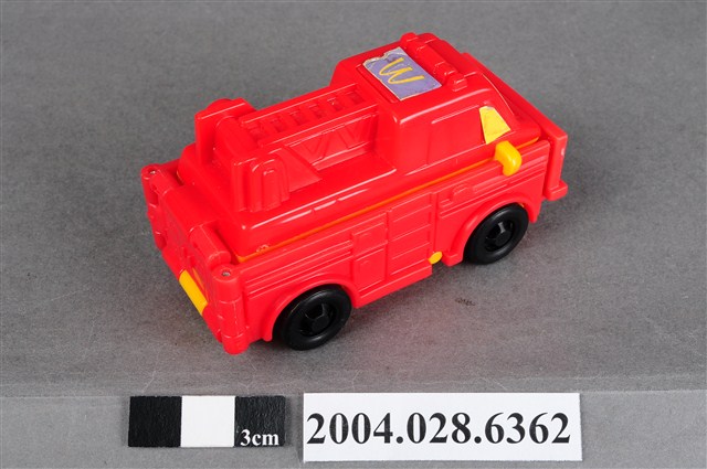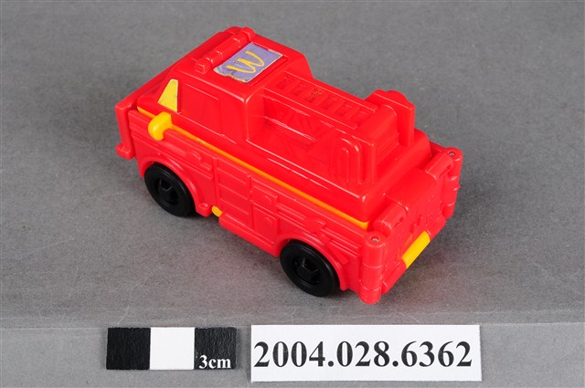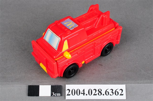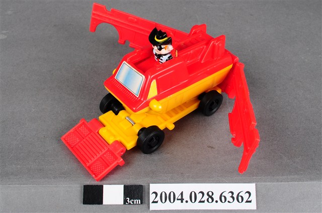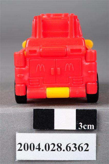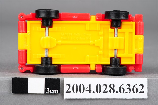 1.本物件為速食餐廳麥當勞玩具,塑膠材質。該物件乃麥當勞漢堡神偷變換車隊之塑膠玩具,主要配色為黃、紅色。該玩具外觀為一輛汽車,汽車整體為紅色,後照鏡及車頭前方的底部為黃色,輪子為黑色。車頭及車尾可見麥當勞商標圖示。其玩具展開後,兩側車門及車頭皆可展開,頂部則為漢堡神偷。汽車底部可見「1997」、「McD's Corp.」、「Made in China」、「KH」字樣。