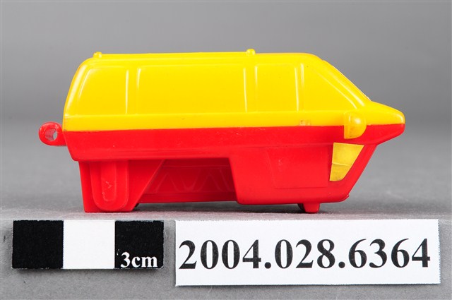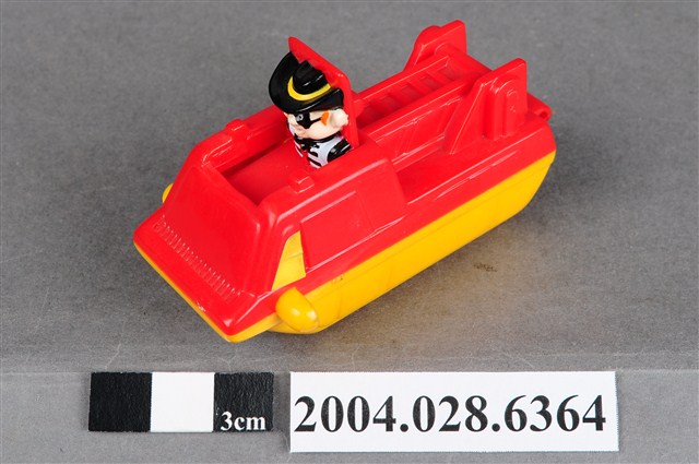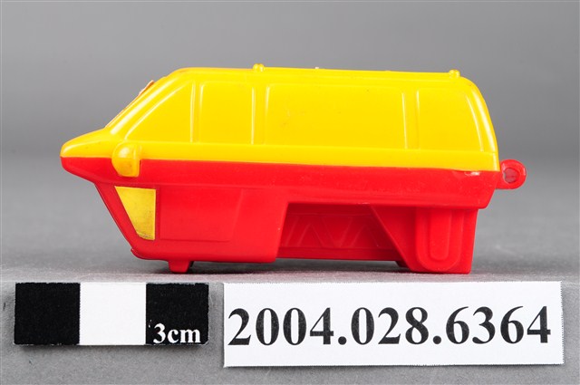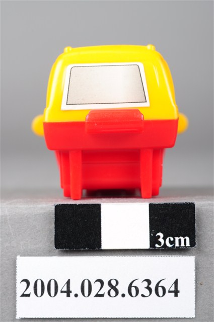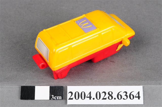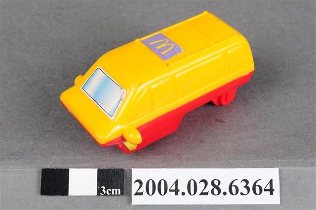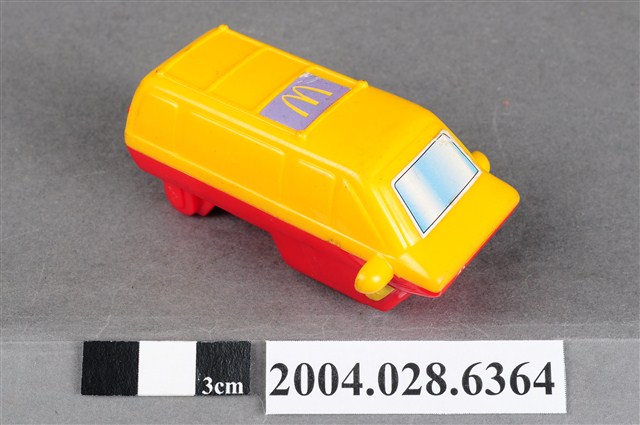 1.本物件為速食餐廳麥當勞玩具,塑膠材質。該物件乃麥當勞漢堡神偷變換車隊之塑膠玩具,主要配色為黃、紅色。該玩具外觀為一輛汽車,汽車上半部為黃色、下半部為紅色。汽車頂部及底部皆可見麥當勞商標圖示。其底部展開可見漢堡神偷。