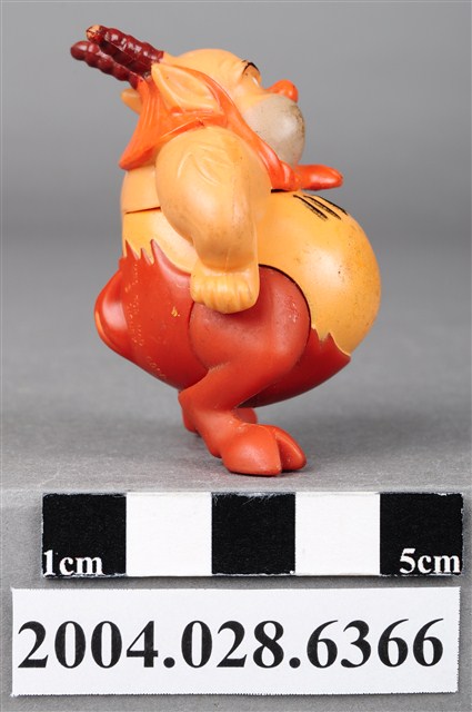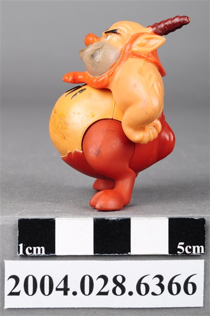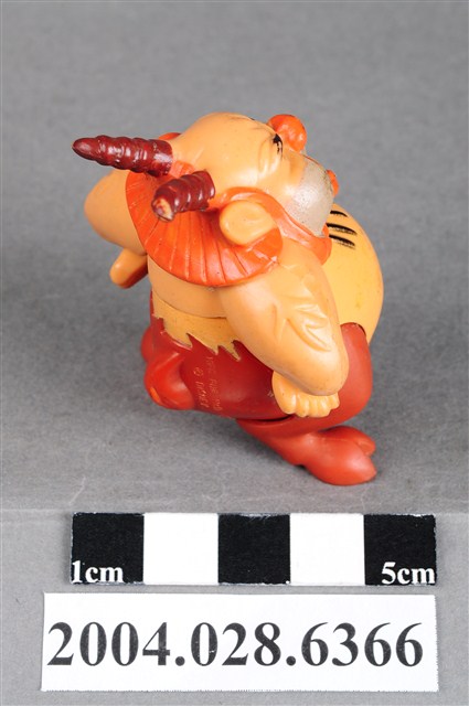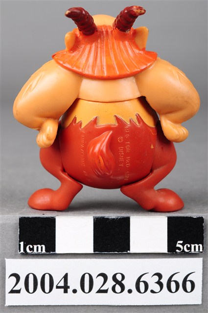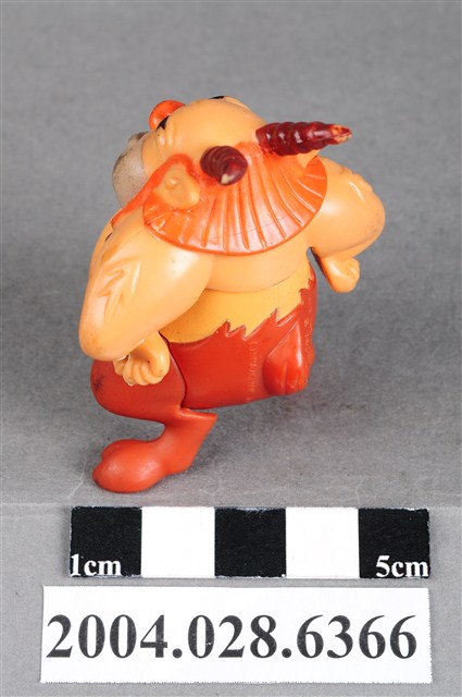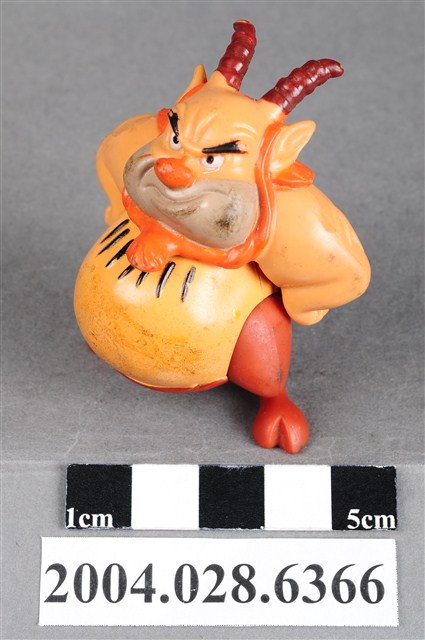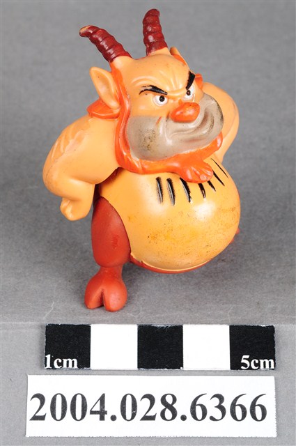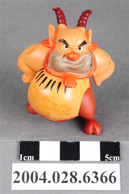 1.本物件為大力士之菲羅斯玩具,菲羅斯為一位羊角人身的角色,頭上有兩支咖啡色的羊角,鼻子為紅色,嘴巴留著鬍渣有棕色的鬃毛,雙手插腰,胸前有黑色的毛,下半身為暗紅色,雙腳成羊腳狀,有蹄。