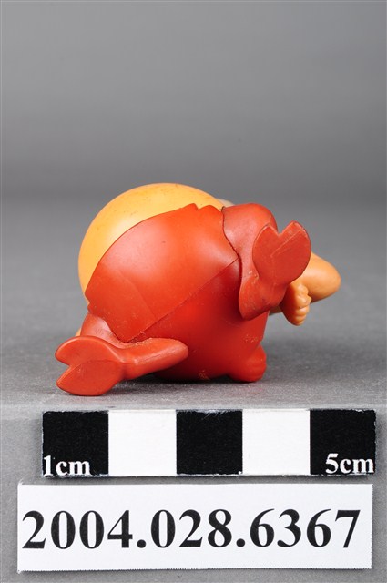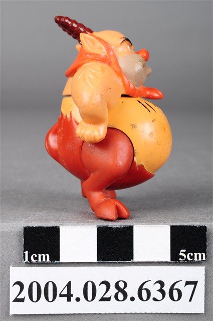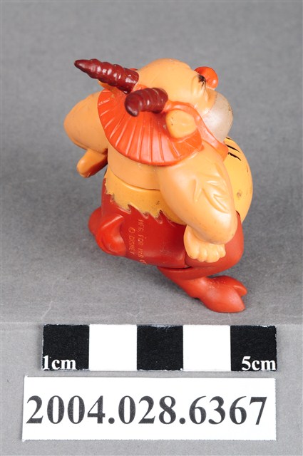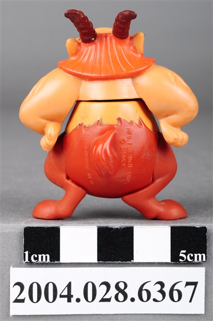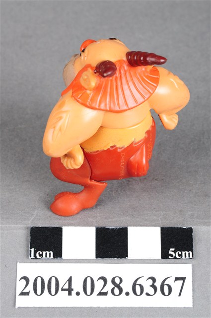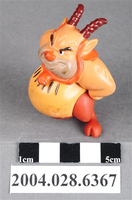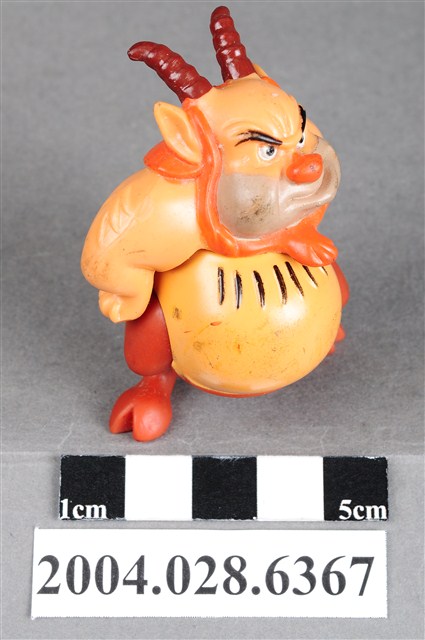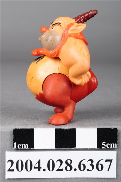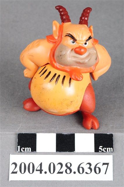 1.本物件為大力士之菲羅斯玩具,菲羅斯為一位羊角人身的角色,頭上有兩支咖啡色的羊角,鼻子為紅色,嘴巴留著鬍渣有棕色的鬃毛,雙手插腰,胸前有黑色的毛,下半身為暗紅色,雙腳成羊腳狀,有蹄。