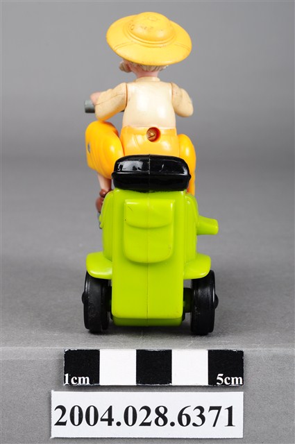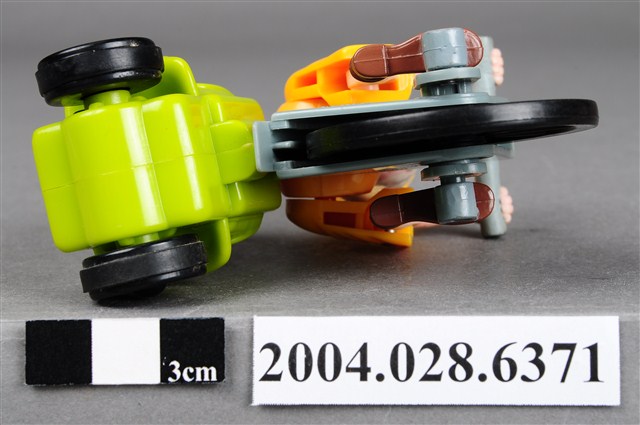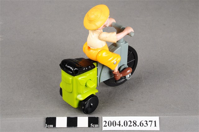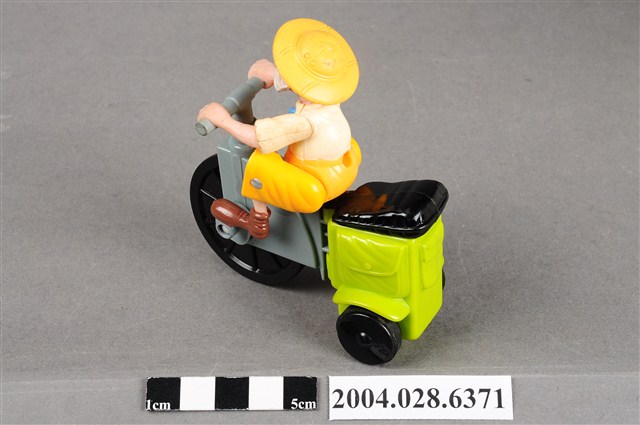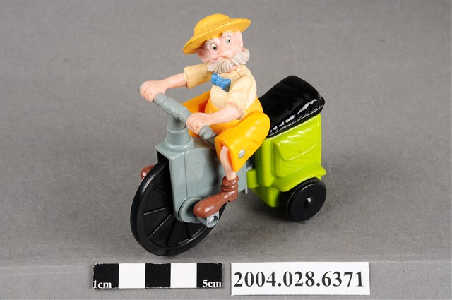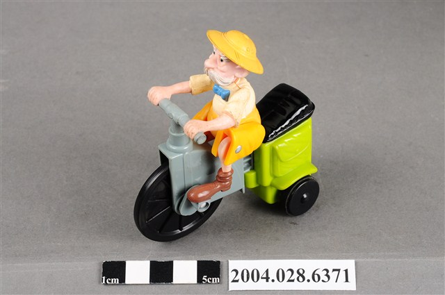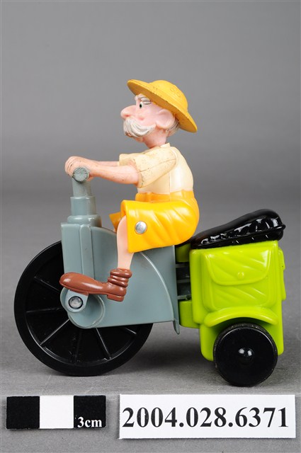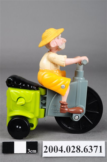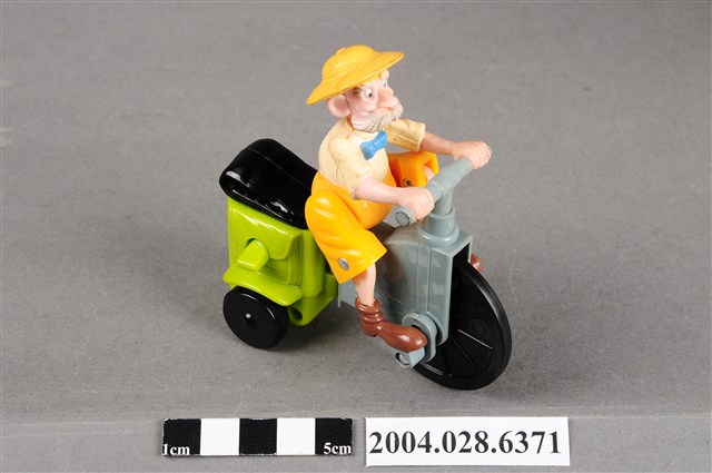 1.本件為泰山之布教授玩具,布教授頭戴黃色帽子,眼睛為藍色,留著八字鬍,衣服為米色戴著藍色領結,褲子為橘色,穿著咖啡色靴子,騎著三輪車,握把及前車身為灰色,後車身為綠色,上有黑色椅墊,三個輪子一個在前兩個在後,前大後小,皆為黑色,車身右方有一只轉扭。前車身右側有「©Burroughs & Disney Tarzen TM ©1999 McDonald΄s Corp Made in China CW S.S.223/24」。