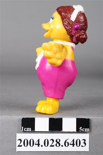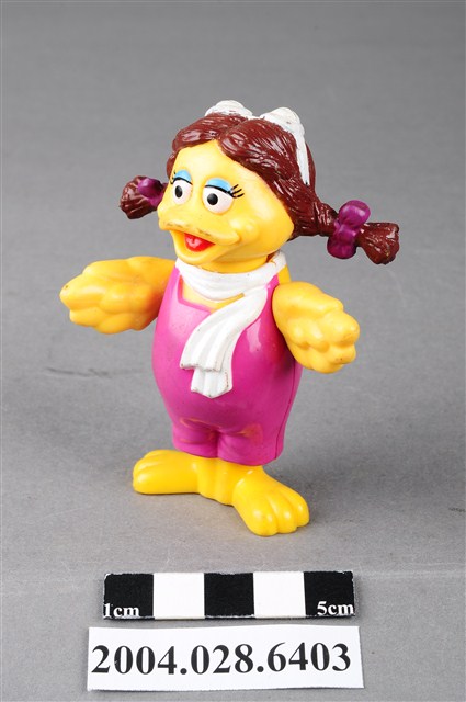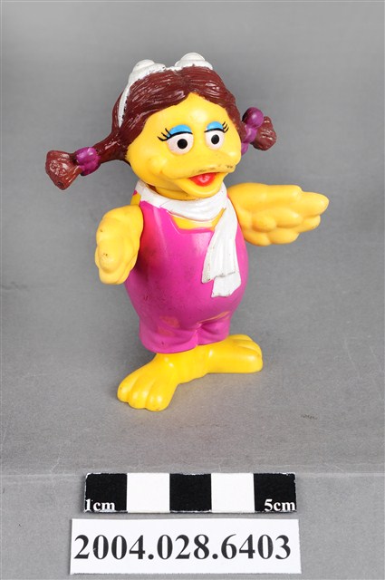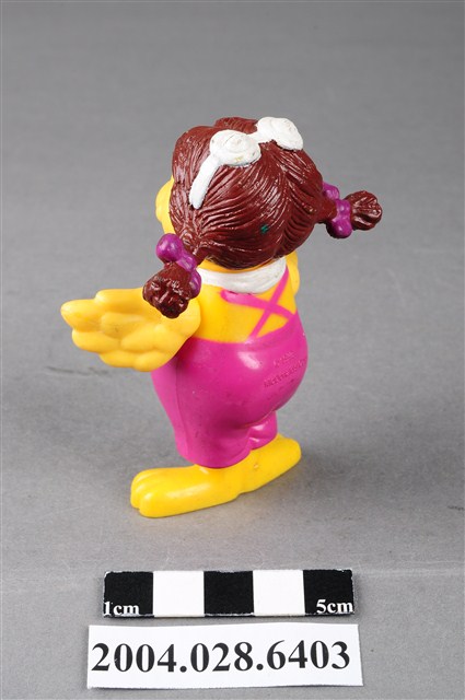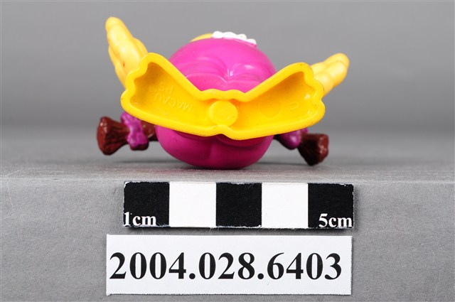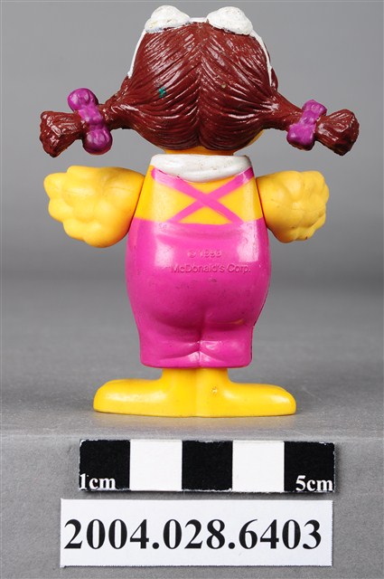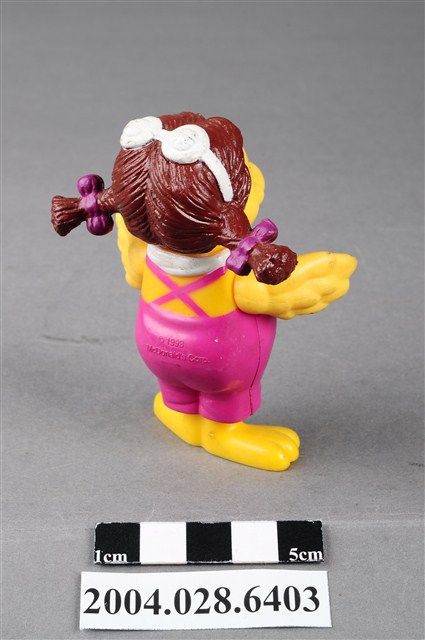 1.本物件為速食餐廳麥當勞玩具,塑膠材質。該物件乃麥當勞大鳥姐姐之塑膠玩具,主要配色為粉紅、黃、白色。該玩具可見大鳥姐姐身著粉紅色連身裙及白色圍巾,呈現雙手張開的姿勢。其背面可見「1998」、「McDonald's Corp」字樣,底部可見「MACAU」、「PS」字樣。