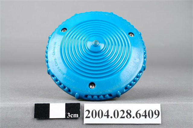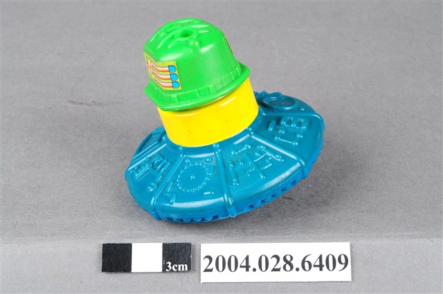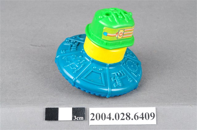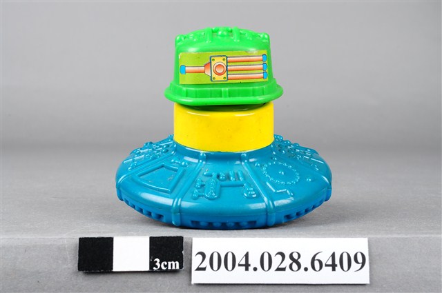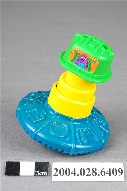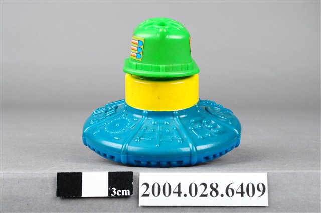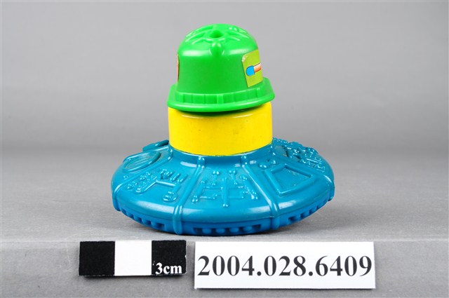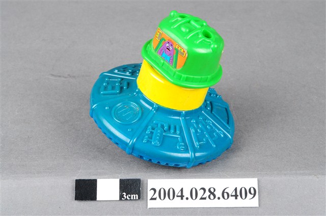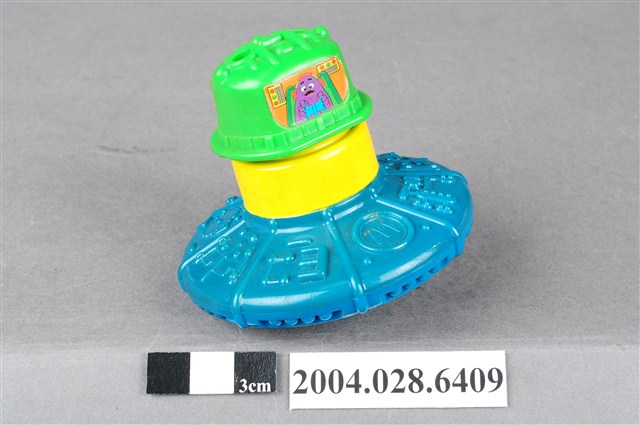 1.本物件為速食餐廳麥當勞玩具,塑膠材質。該物件乃麥當勞奶昔大哥星際飛碟之塑膠玩具,主要配色為綠、黃、藍色。該玩具外觀為一架綠、黃、藍色的飛碟,奶昔大哥位於上層綠色駕駛座,藍色飛碟底部可見浮刻的紋路。其底部可見「1996」、「McD's Corp.」、「China IM」字樣。