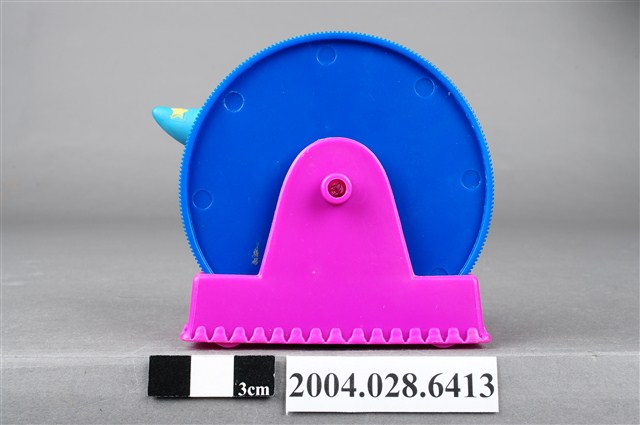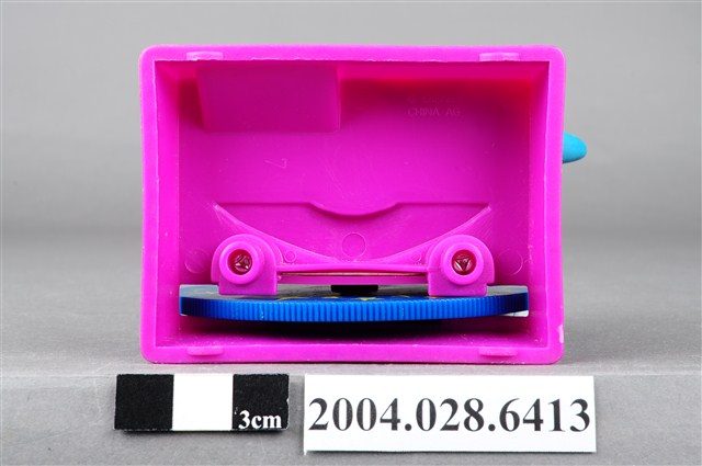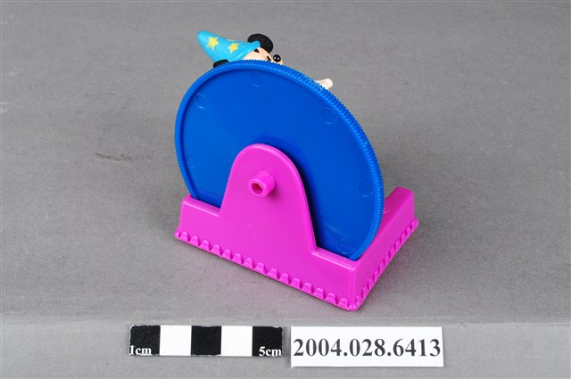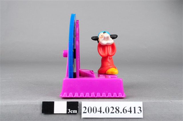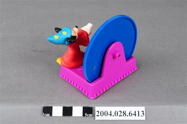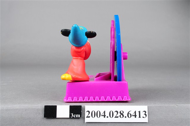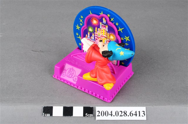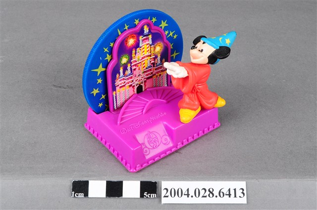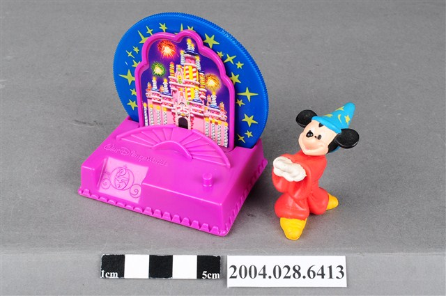 1.本物件為速食餐廳麥當勞玩具,塑膠材質。該物件乃麥當勞25週年米奇幻想曲之塑膠玩具,主要配色為藍、紫、紅色。該玩具外觀為米老鼠身著紅長袍、頭戴藍色帽子,站立於紫色平臺上。其背景為煙火燦爛的迪士尼樂園。該玩具可見「WALT DISNEY World」、「25」、「DISNEY」、「CHINA」、「AG」字樣。