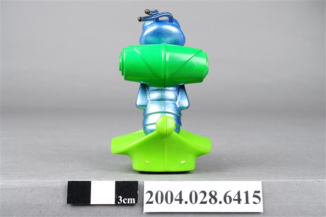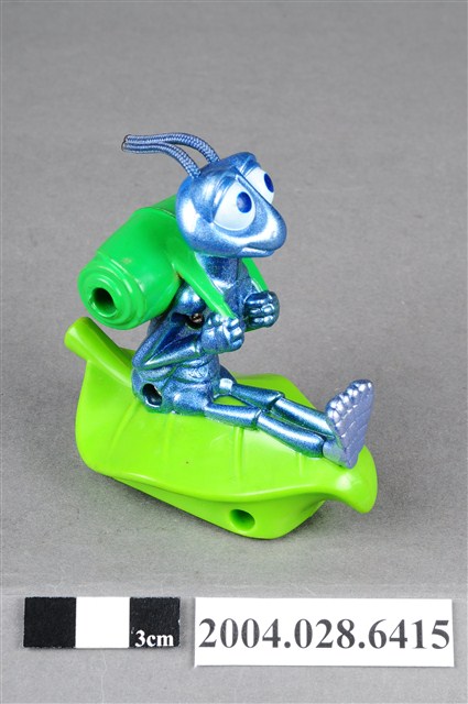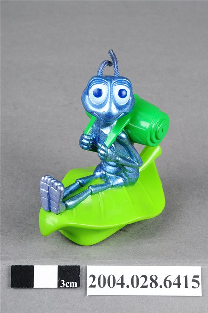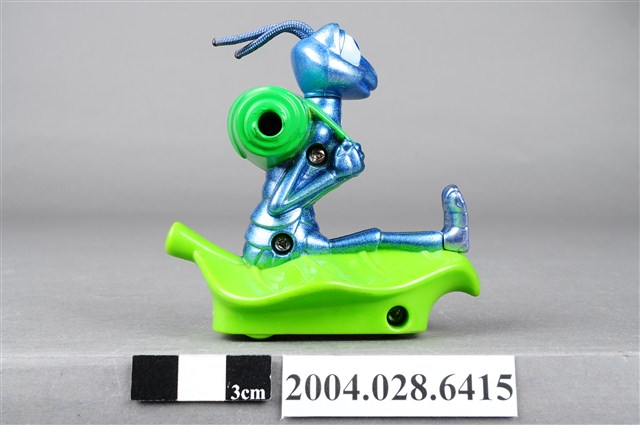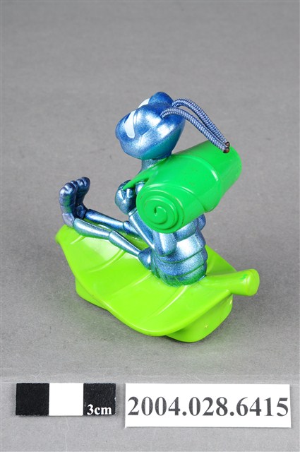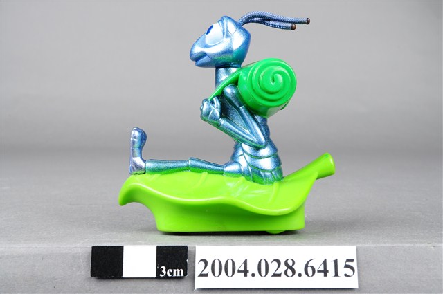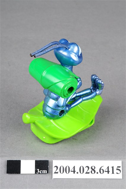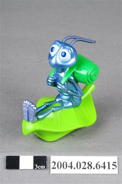 1.本物件為速食餐廳麥當勞玩具,塑膠材質。該物件乃麥當勞蟲蟲危機菲力之塑膠玩具,主要配色為藍、綠色。該玩具外觀為一隻螞蟻身揹綠色捲葉背包,雙手握緊背帶,坐在葉子上。其底部可見「MFG. FOR McD. CORP.」、「CHINA/CHINE HK 12」、「DISNEY/PIXAR」、「89/S.S. 223」字樣。