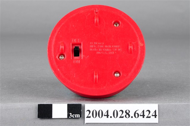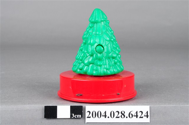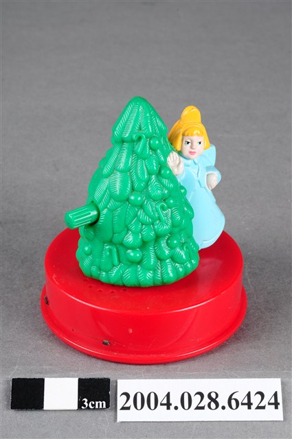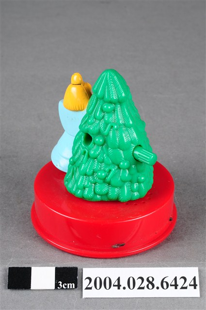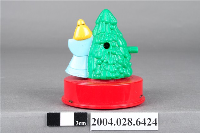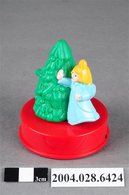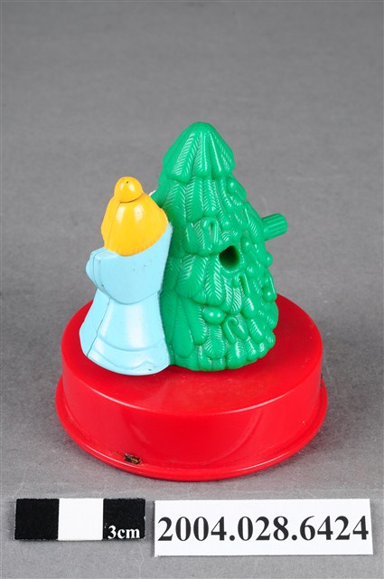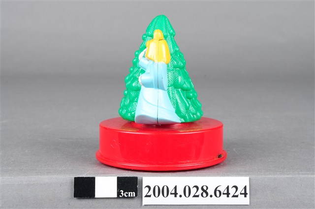1.本物件為美女與野獸:貝兒的心願之安傑莉玩具,安傑莉頭髮為黃色,身穿藍色洋裝,靠在一旁綠色的聖誕樹上,聖誕樹為綠色旁邊有一轉輪,底座為紅色,周遭有一些污漬,底座底部周遭鎖上三根螺絲,中間有一開關上下分別有「OFF」跟「ON」字樣,旁邊則有「©Disney MFG.FOR McD. Corp Made in China SV 05 80 S.S.223」字樣