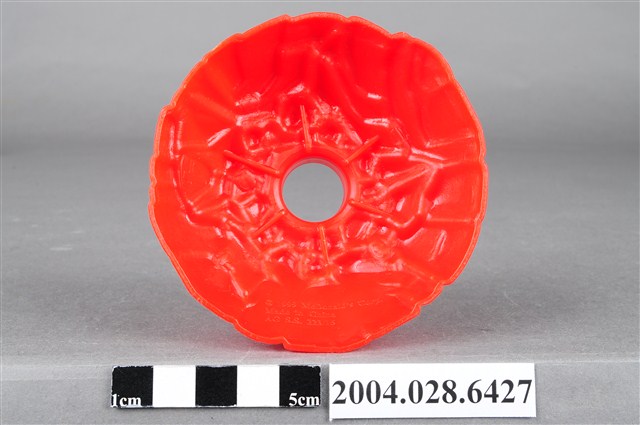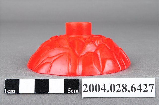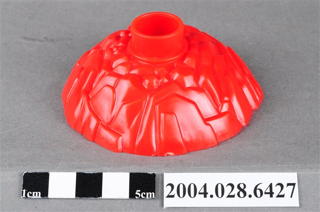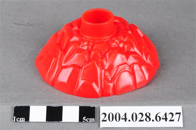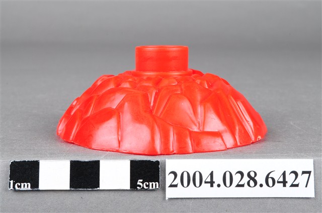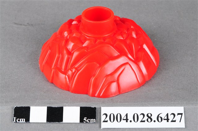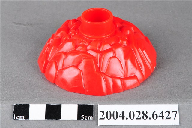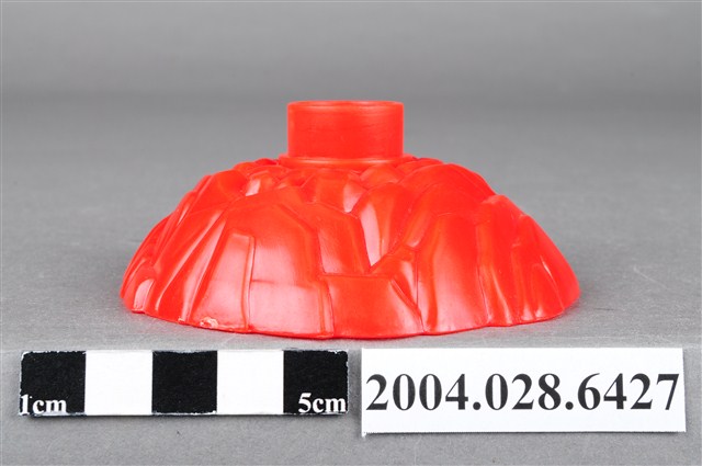 1.本物件為麥當勞漢堡神偷旋轉塔底座,整體為紅色,成一小土丘狀,上有如岩石般紋路,頂端有一塊突起物,用來插上其他零件,內側有「©1999 McDonald΄s Corp. Made in China AG S.S.223/15」字樣。