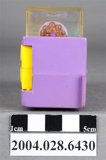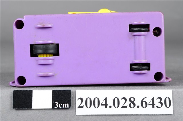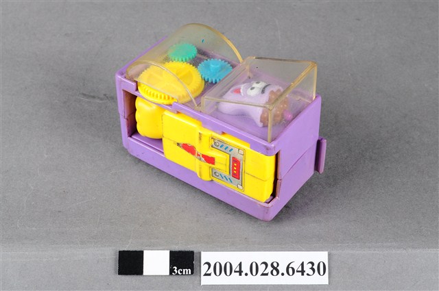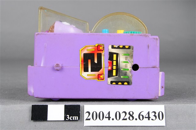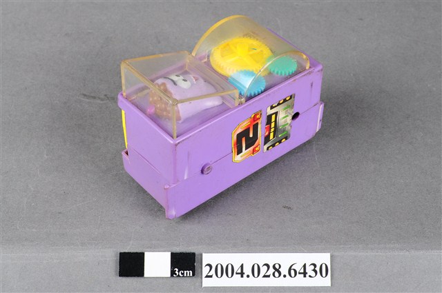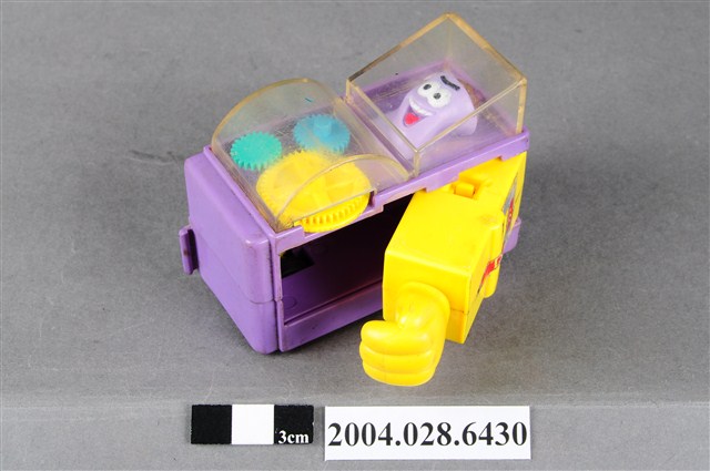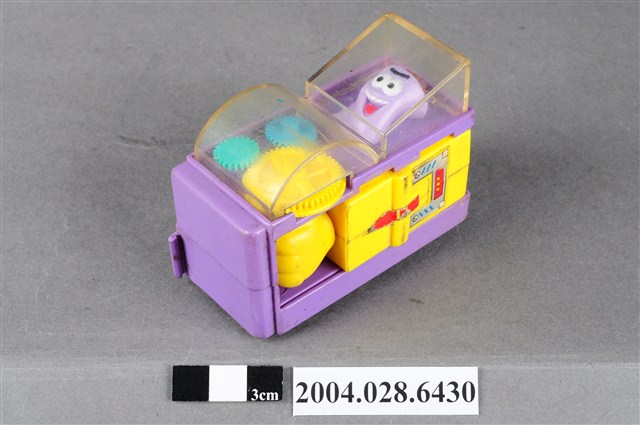1.本物件為速食餐廳肯德基玩具,塑膠材質。該物件乃肯德基奶昔車之塑膠玩具,主要配色為紫、黃色。該玩具外觀為一輛紫色車子,上頭可見壓克力透明板,內部有一杯紫色奶昔。側面為黃色可活動式設計的物件。