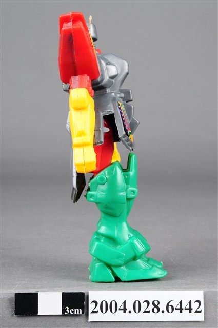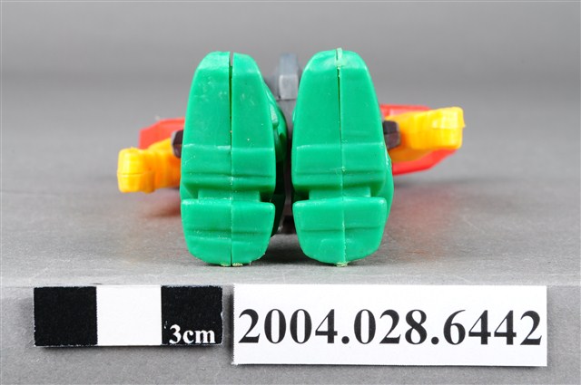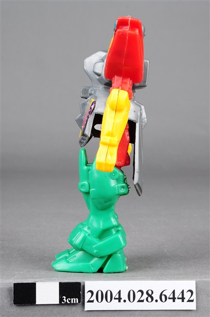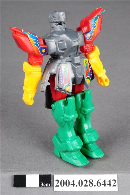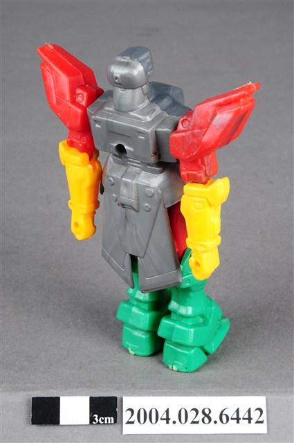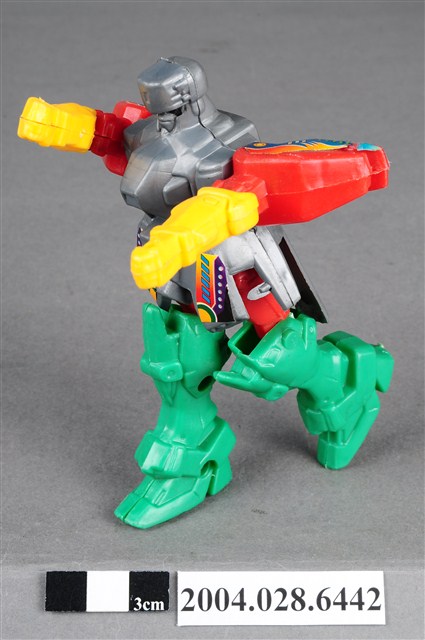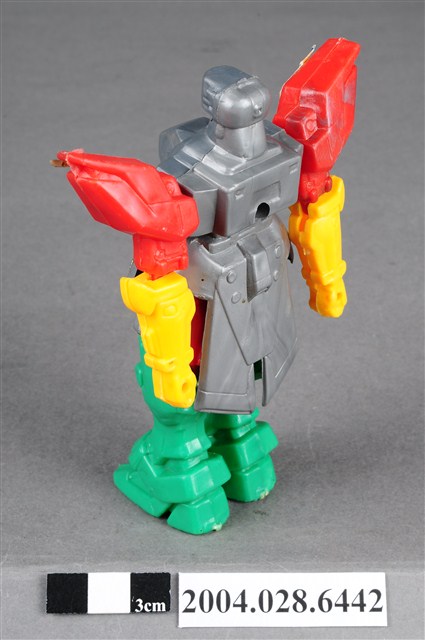本物件為機器人玩具,材質為塑膠,整體色彩繽紛,機器人頭部、胸腹為銀灰色,左右兩肩為紅色,下臂為紅色,雙腳則為綠色,機器人雙臂及雙腳為可動式關節。