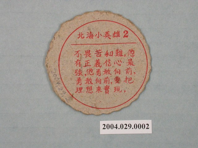 1.本物件為無敵鐵金剛國隆尪仔標,為圓形花邊紙質卡牌,正面中央圖樣為無敵鐵金剛國隆人物圖,左下有一行紅色文字「國隆無敵鉄金剛」,四方各有圖紋,上方為撲克牌的「紅心」圖樣,右方為「士」,下方為猜拳中的「石頭」,左方為生肖中的「狗」,其中士、石頭與狗為藍色圖紋,紅心為紅色圖紋;背面有「北海小英雄2 不畏苦和難,他有正義信心,最強,他勇敢向前,要把理想來實現,」紅色字樣。