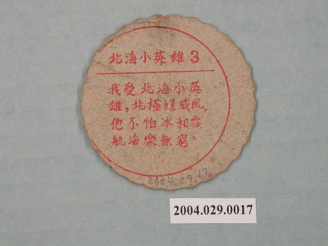 1.本物件為科學小飛俠尪仔標,為圓形花邊紙質卡牌,正面圖樣為阿明人物圖。周遭各有圖紋,上方為生肖中的「龍」,因裁切不完整,右上為生肖中的「牛」,右下有飛俠字樣左側則有猜拳中的「布」,龍、牛、布皆為藍色圖樣;背面為紅色「北海小英雄3 我愛北海小英雄,北極逞威風,他不怕冰和雪航海樂無窮。」文字。