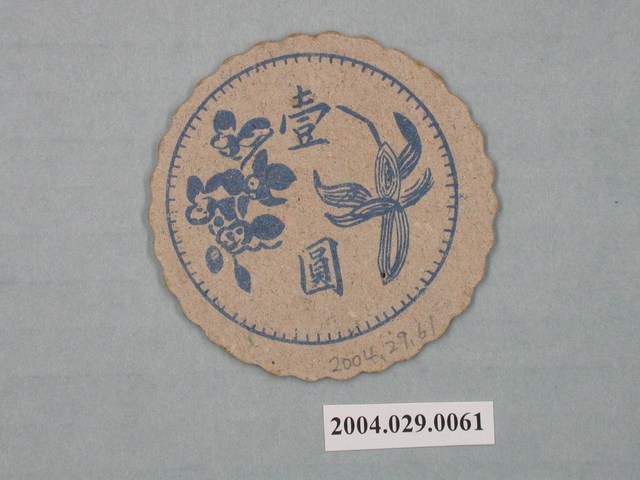1.本物件為科學小飛俠4號阿丁尪仔標,為圓形花邊紙質卡牌,正面中央圖樣為4號阿丁人物圖,左方有「科學小飛俠四號阿丁」紅色字樣,四方各有圖紋,上方為撲克牌的「方塊」,右方為猜拳中的「剪刀」圖樣,下方為生肖中的「猴」,左方為「馬」,其中剪刀、猴與馬為藍色圖紋,方塊為紅色圖紋;背面為藍色錢幣圖樣,中央有「壹圓」字樣。