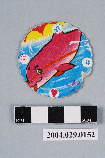 1.本物件為海底小遊俠尪仔標,為圓形花邊紙質卡牌,正面中央圖案為動畫海底小遊俠內主角小遊俠,黑髮藍眼,身穿紅色潛水衣,背景於海中,正面上右下左各分別有「蛇」、「卒」、「撲克牌-菱形」、「猜拳-石頭」圖案與藍色字樣;中央圖案為動畫海底小遊俠內小海豚小白,身體為粉紅色,側邊有一條紅色縱帶,背景於海中,左上方為黃底並有紅色M字型圖案,背面上右下左各分別有「猜拳-剪刀」、「鷄」、「撲克牌-紅心」、「仕」圖案與字樣,「鷄」為藍字,「仕」為紅字。