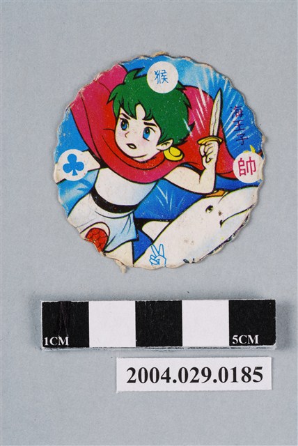 1.本物件為海底小遊俠之人魚妞妞尪仔標,為圓形花邊紙質卡牌,正面中央圖案為動畫海底小遊俠內人魚妞妞,金長髮,藍眼,身穿紅衣,手拿圓形物體,正面上右下左各分別有「撲克牌-菱形」、「龍」、「帥」、「猜拳-布」圖案與字樣,「龍」為藍字,「帥」為紅字;背面中央圖案為動畫海王子內主角海王子與海豚露嘉(另有譯名海豚露卡),海王子為綠短髮,身穿白衣,披有紅色披風,手持奧利漢短劍,後方有海豚露嘉(另有譯名海豚露卡),身體為白色,額頭上有黃色V字型圖案,場景位於海中,背面右上有「海王子」藍色字樣,背面上右下左個分別有「猴」、「將」、「猜拳-剪刀」、「撲克牌-梅花」圖案與字樣,「猴」為藍字,「帥」為紅字。