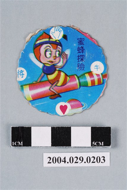 1.本物件為海王子與海豚露嘉尪仔標,為圓形花邊紙質卡牌,正面中央圖案為動畫海王子內主角海王子與海豚露卡,海王子為綠短髮,身穿白衣,披有紅色披風,左手持奧利漢短劍,海豚露嘉(另有譯名海豚露卡)身體為白色,頭上戴有飾品,場景於海洋中,正面右上有「海王子」藍色字樣,正面上右下左各分別有「撲克牌-菱形」、「羊」、「兵」、「猜拳-布」圖案與字樣,「羊」為藍字,「兵」為紅字;背面中央圖案為卡通小蜜蜂尋親記內主角小蜂,橘頭、藍胸、黃橘相間腹,乘坐於類似火箭的飛行器上,背景為藍色,背面右上有「蜜蜂探險」藍色字樣,背面上右下左各分別有「猜拳-布」、「牛」、「撲克牌-紅心」、「將」圖案與藍色字樣。