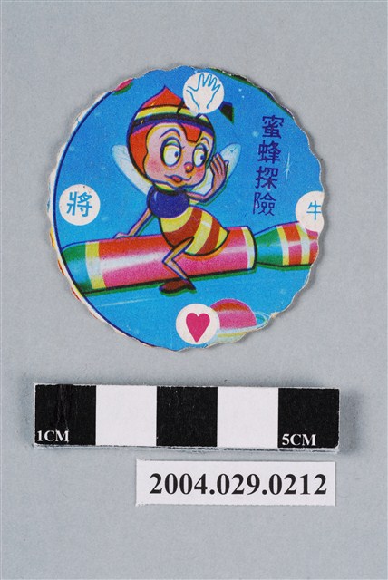 1.本物件為海王子與海豚露嘉尪仔標,為圓形花邊紙質卡牌,正面圖案裁切不完整,中央圖案為動畫海王子內主角海王子與海豚露嘉(另有譯名海豚露卡),海王子為綠短髮,身穿白衣,披有紅色披風,左手持奧利漢短劍,海豚露嘉身體為白色,頭上戴有飾品,場景於海洋中,正面右上有「海王子」藍色字樣,正面上右下左各分別有「撲克牌-菱形」、「羊」、「兵」、「猜拳-布」圖案與字樣,「羊」為藍字,「兵」為紅字;背面中央圖案為卡通小蜜蜂尋親記內主角小蜂,橘頭、藍胸、黃橘相間腹,乘坐於類似火箭的飛行器上,背景為藍色,背面右上有「蜜蜂探險」藍色字樣,背面上右下左各分別有「猜拳-布」、「牛」、「撲克牌-紅心」、「將」圖案與藍色字樣。