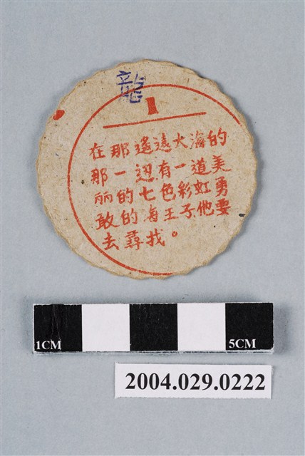 1.本物件為海王子與海豚露嘉尪仔標,為圓形花邊紙質卡牌,正面中央圖案為動畫海王子內主角海王子與海豚露嘉(另有譯名海豚露嘉),海王子為藍短髮,身穿橘衣,披有紅色披風,腰間配帶奧利漢短劍,騎乘於海豚露嘉身上,露嘉身體為粉紅色、白色,額頭有V字型圖案,背景為黃、白、藍漸層,畫面中央有「海王子」、「白海豚」藍色字樣,正面右上、右下、左下、左上各分別有「撲克牌-紅心」、「將」、「猜拳-石頭」、「龍」圖案與藍色字樣;背面中央圖案為,背面中央以紅色蓋印海王子歌詞,內容有「1」、「在那遙遠大海的那一边有一道美丽的七色彩虹勇敢的海王子他要去尋找」字樣,背面上方有藍色原子筆寫下的「龍」字樣。