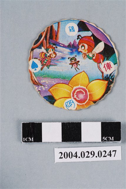 1.本物件為「小蜜蜂之小蜜蜂與母親尪仔標」。為圓形花邊紙質卡牌,正面中央圖樣為小蜜蜂與母親擁抱圖,右下有一行文字「小蜜蜂與母親」。四方各有圖紋,上方為猜拳中的「拳頭」圖樣,右方為生肖中的「虎」,下方為撲克牌的「紅心」,左方為「帥」,其中拳頭與虎為藍色圖紋,帥與紅心為紅色圖紋。背面圖樣為小蜜蜂與同伴們,上方為生肖中的「鷄」,右方為象棋中的「俥」,下方為猜拳中的「拳頭」圖樣,左方為撲克牌中的「黑桃」,其中鷄、黑桃與拳頭為藍色圖紋,俥為紅色圖紋。
