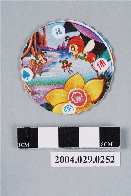 1.本物件為「小蜜蜂之小蜜蜂與母親尪仔標」。為圓形花邊紙質卡牌,正面中央圖樣為小蜜蜂與母親擁抱圖,右下有一行文字「小蜜蜂與母親」。四方各有圖紋,上方為猜拳中的「拳頭」圖樣,右方為生肖中的「虎」,下方為撲克牌的「紅心」,左方為「帥」,其中拳頭與虎為藍色圖紋,帥與紅心為紅色圖紋。背面圖樣為小蜜蜂與同伴們,上方為生肖中的「鷄」,右方為象棋中的「俥」,下方為猜拳中的「拳頭」圖樣,左方為撲克牌中的「黑桃」,其中鷄、黑桃與拳頭為藍色圖紋,俥為紅色圖紋。