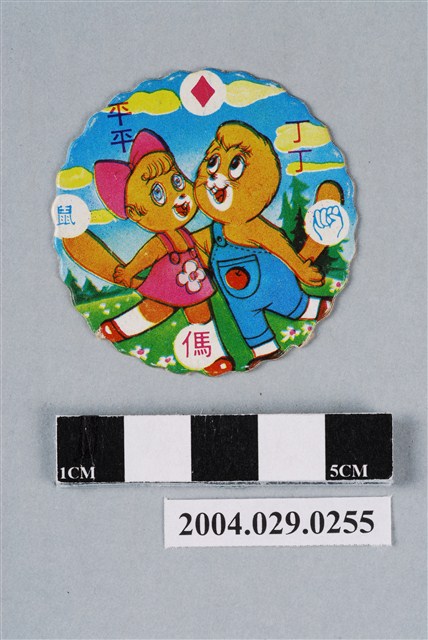 1.本物件為「小蜜蜂之蜜蜂與花尪仔標」。為一圓形花邊紙質卡牌,正面中央圖樣為兩隻小蜜蜂,右上有一行文字「蜜蜂與花」。四方各有圖紋,上方為生肖中的「羊」,右方為猜拳中的「拳頭」圖樣,下方為象棋中的「帥」,左方為撲克牌中的「梅花」圖樣,其中拳頭、梅花與羊為藍色圖紋,帥為紅色圖紋。背面圖樣為「丁丁與平平」的角色,右上與左上各印有「丁丁」、「平平」字樣。上方為撲克牌中的「方塊」,右方為猜拳中的「拳頭」圖樣,下方為象棋中的「傌」,左方為生肖中的「鼠」,其中拳頭、鼠為藍色圖紋,方塊與傌為紅色圖紋。