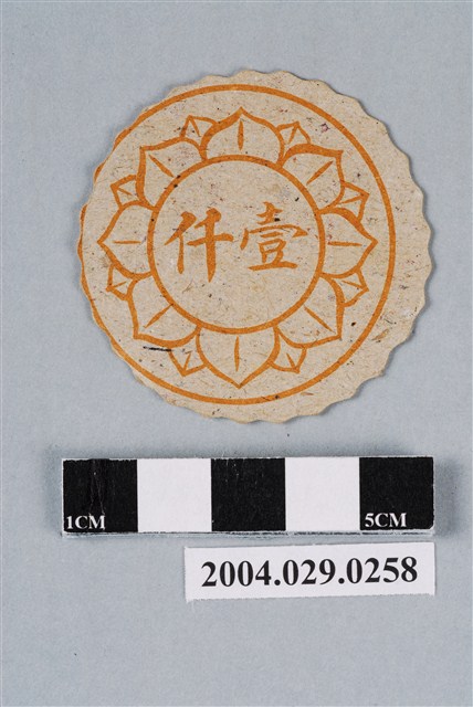 1.本物件為「小蜜蜂尪仔標」。為一圓形花邊紙質卡牌,正面中央圖樣為兩隻小蜜蜂,左上有一行藍色文字「小蜜蜂」。四方各有圖紋,上方為撲克牌中的「方塊」圖樣,右方為象棋中的「包」,下方為生肖中的「狗」,左方為猜拳中的「剪刀」圖樣,其中包、剪刀與狗為藍色圖紋,方塊為紅色圖紋。背面字樣為黃色的「壹仟」,周邊由一圈花瓣圍繞。