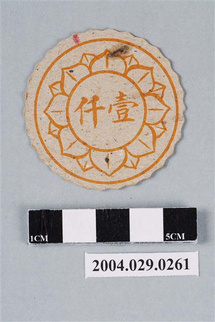 1.本物件為「小蜜蜂尪仔標」。為一圓形花邊紙質卡牌,正面中央圖樣為兩隻小蜜蜂,左上有一行藍色文字「小蜜蜂」。四方各有圖紋,上方為撲克牌中的「方塊」圖樣,右方為象棋中的「包」,下方為生肖中的「狗」,左方為猜拳中的「剪刀」圖樣,其中包、剪刀與狗為藍色圖紋,方塊為紅色圖紋。背面字樣為黃色的「壹仟」,周邊由一圈花瓣圍繞。上方有污漬與紅色畫痕。