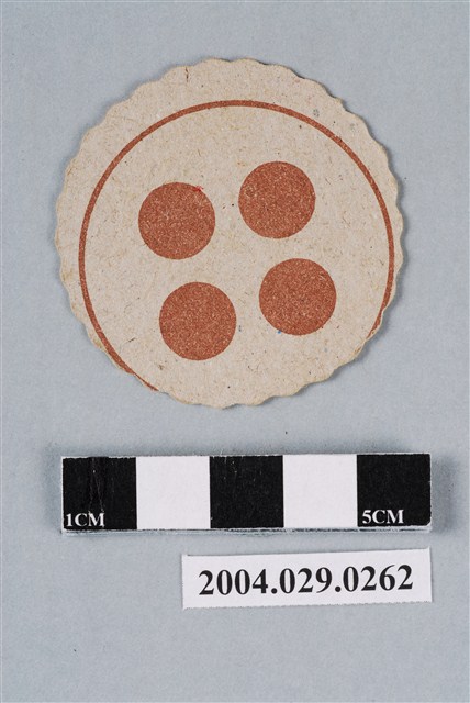 1.本物件為「小蜜蜂尪仔標」。為一圓形花邊紙質卡牌,正面中央圖樣為兩隻小蜜蜂,左上有一行藍色文字「小蜜蜂」。四方各有圖紋,上方為撲克牌中的「梅花」圖樣,右方為生肖中的「龍」,下方為猜拳中的「剪刀」圖樣,左方為象棋中的「兵」圖樣,其中梅花、龍與剪刀為藍色圖紋,兵為紅色圖紋。背面圖樣為咖啡色的骰子點數「四」。