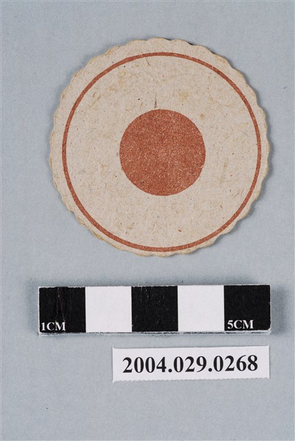 1.本物件為「小蜜蜂尪仔標」。為一圓形花邊紙質卡牌,正面中央圖樣為兩隻小蜜蜂。四方各有圖紋,上方為撲克牌中的「紅心」圖樣,右方為生肖中的「猴」,下方為猜拳中的「剪刀」圖樣,左方為象棋中的「車」圖樣,其中猴、車與剪刀為藍色圖紋,紅心為紅色圖紋。背面圖樣為咖啡色的骰子點數「一」。