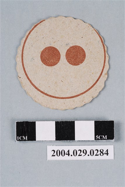 1.本物件為「小蜜蜂尪仔標」。為一圓型花邊紙質尪仔標。正面圖樣為小蜜蜂與花,四方皆有藍色圖案,上方為撲克牌中的「梅花」圖樣,右方為生肖中的「狗」,下方為猜拳中的「布」圖樣,左方為象棋中的「象」。背面中央為咖啡色的骰子點數「二」。