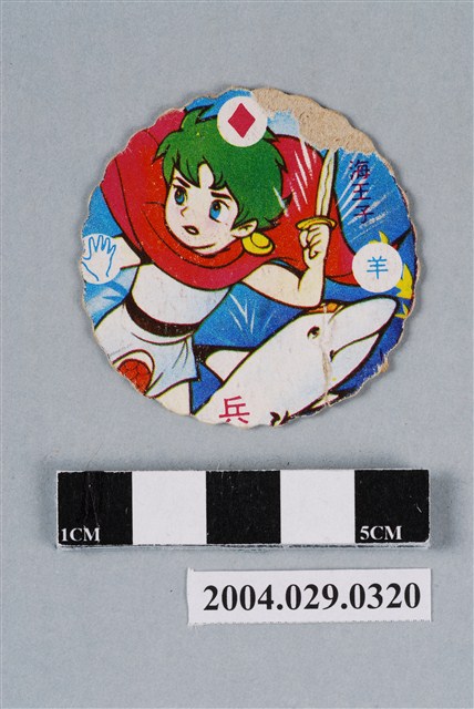 1.本物件為「小蜜蜂之蜜蜂探險尪仔標」。為一圓型花邊紙質尪仔標。正面圖樣為坐在某物上的小蜜蜂,四方皆有圖案,上方為猜拳中的「布」圖樣,右方為生肖中的「牛」,下方為撲克牌中的「紅心」圖樣,左方為象棋中的「將」,其中紅心為紅色,布、牛與將為藍色。背面圖案為海王子與海豚,右上方有「海王子」三字,四方皆有圖案,上方為撲克牌中的「方塊」圖樣,右方為生肖中的「羊」,下方為象棋中的「兵」,左方為猜拳中的「布」,其中方塊與兵為紅色,布、羊為藍色。