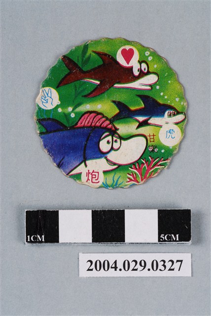 1.本物件為「小蜜蜂與母親翁仔標」。為圓形花邊紙質卡牌,正面中央圖樣為小蜜蜂與母親擁抱圖,右下有1行文字「小蜜蜂與母親」。四方各有圖紋,上方為猜拳中的「拳頭」圖樣,右方為生肖中的「虎」,下方為撲克牌的「紅心」,左方為「帥」,其中拳頭與虎為藍色圖紋,帥與紅心為紅色圖紋。背面圖樣為海王子之海豚3兄弟,中央圖案為動畫海王子之海豚3兄弟,畫面上方海豚為一樂(另有譯伊魯),身體顏色為棕色,中央海豚為:甘樂(另有譯卡魯),身體顏色為深藍色,下方海豚為菲兒(另有譯芬),身體顏色為深藍色,頭戴1塊貝殼,場景於海洋中,背景有海草與珊瑚,右下角印有紅字「甘樂」,四方皆有圖案,右上方為撲克牌中的「紅心」圖樣,右下方為生肖中的「虎」,左下方為象棋中的「炮」,左上方為猜拳中的「剪刀」圖樣,其中紅心與炮為紅色,虎與剪刀為藍色。