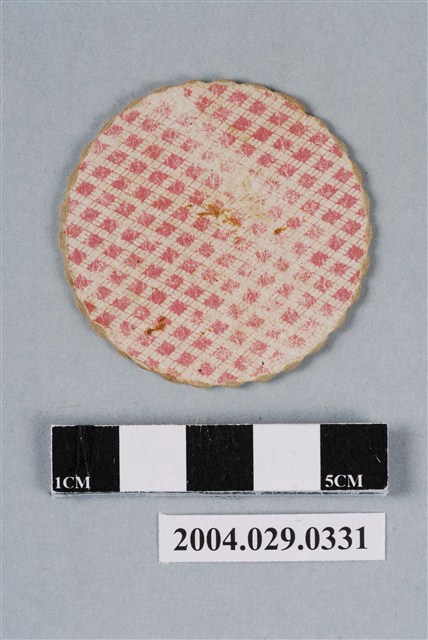1.本物件為「小蜜蜂之小蜜蜂與青蛙尪仔標」。為一圓型花邊紙質尪仔標,表面破損。正面小蜜蜂坐在青蛙身上的圖樣,右上印有黑色「小蜜蜂青蛙」,四方皆有圖案,上方為撲克牌中的「紅心」圖樣,右方為猜拳中的「布」圖樣,下方為生肖中的「猴」,左方為象棋中的「士」,其中紅心為紅色,布、士與猴為黑色。背面為紅色花瓣圖樣。