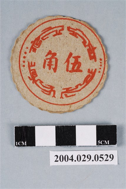 1.本物件為無敵鐵金剛尪仔標,呈圓扁狀,邊緣呈波浪狀,正面為紙質,中央圖案為動畫無敵鐵金剛的木蘭號,木蘭號為動畫內的角色莎莎所操控的機器人,正面上右下左各分別有「仕」、「猜拳-布」、「猴」、「撲克牌-黑桃」圖案與字樣,「猴」為藍字,「仕」為紅字;背面為紅色錢幣圖樣,中央有「伍角」紅色字樣。