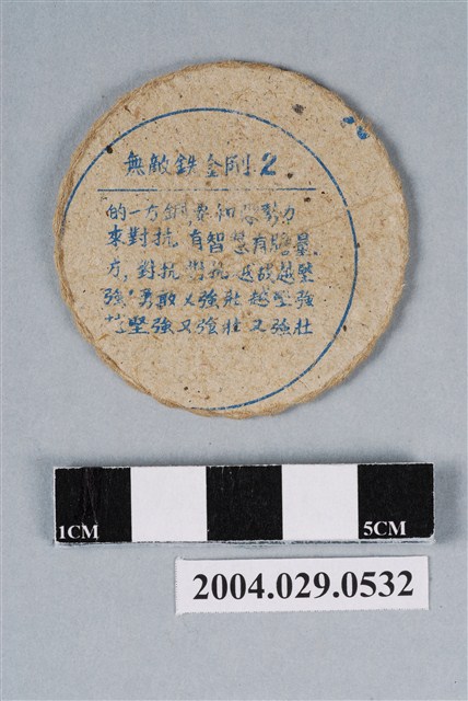 1.本物件為無敵鐵金剛木蘭號尪仔標,呈圓扁狀,邊緣呈波浪狀,正面為紙質,中央圖案為動畫無敵鐵金剛的木蘭號飛在空中的樣子,背後場景為一座火山,木蘭號為動畫內的角色莎莎所操控的機器人,正面右上有「木蘭号」藍色字樣,左方有「金剛」藍色字樣,有正面上右下左各分別有「撲克牌-菱形」、「炮」、「猜拳-剪刀」、「馬」圖案與字樣,「馬」為藍字,「炮」為紅字;背面為「無敵鉄金剛2的一方銅要和惡勢力來對抗,有智慧有膽量,方,對抗對抗越战越堅強,勇敢又強壯越堅強越堅強又強壯又強壯」藍色字樣,字體有磨損。