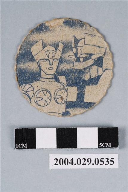 1.本物件為無敵鐵金剛尪仔標,呈圓扁狀,邊緣呈波浪狀,正面為紙質,中央圖案為動畫無敵鐵金剛的木蘭號與無敵鐵金剛,左方為木蘭號,右方為無敵鐵金剛,木蘭號為動畫內的角色莎莎所操控的機器人,無敵鐵金剛則由主角國隆操縱,正面左上有「無敵鐵金鋼」藍色字樣,有正面上右下左各分別有「撲克牌-菱形」、「猜拳-拳頭」、「牛」、「將」圖案與字樣,「馬」、「將」皆為藍字;背面為「木蘭號與無敵鐵金剛」藍色字樣,左方為木蘭號,右方為無敵鐵金剛。