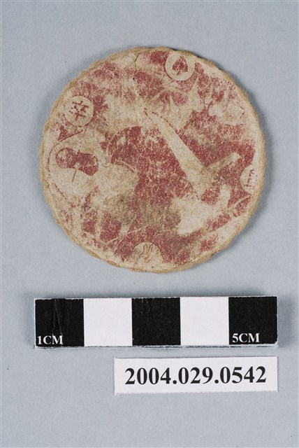 1.本物件為無敵鐵金剛尪仔標,呈圓扁狀,邊緣呈波浪狀,正面為紙質,中央圖案為無敵鐵金剛,但因磨損而不易辨識,正面上右下左各分別有「撲克牌-方塊」、「羊」、「猜拳-剪刀」、「仕」圖案與字樣,「羊」為藍字,「仕」為紅字;背面中央為褐色圖案但因磨損已無法辨識,上右下左各分別有「撲克牌-黑桃」、「帥」、「猜拳-剪刀」、「卒」圖案與字樣。