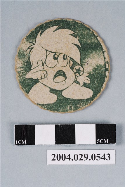 1.本物件為鋼鐵吉克尪仔標,呈圓扁狀,邊緣呈波浪狀,正面為紙質,中央圖案為鋼鐵吉克與反派打鬥圖,正面上右下左各分別有「撲克牌-紅心」、「鼠」、「猜拳-剪刀」、「帥」圖案與字樣,「帥」為藍字,「鼠」為紅字;背面中央為綠色星星王子圖案。