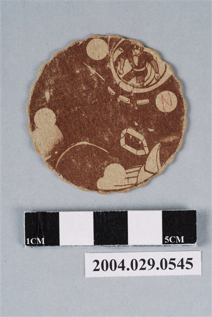 1.本物件為無敵鐵金剛國隆大戰機械獸尪仔標,呈圓扁狀,邊緣呈波浪狀,正面為紙質,中央圖案為主角國隆搭乘紅色指揮挺攻擊下方的機械獸,機械獸身體為綠色,頭上有三支紅色的角,嘴裡有獠牙,正面上右下左各分別有「撲克牌-黑桃」、「猜拳-拳頭」、「龍」、「將」圖案與字樣,「龍」、「將」皆為藍字;背面為正面圖案的鏡像,但僅有褐色一色,上右下左有四格白色圓圈,右側被以紅筆寫上「N」字樣。