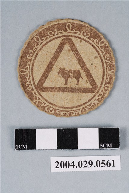 1.本物件為無敵鐵金剛國盛與博士尪仔標,呈圓扁狀,邊緣呈波浪狀,正面為紙質,中央圖案為國盛與博士,左下有「國盛與博士」紅色字樣,正面上右下左各分別有「俥」、「牛」、「撲克牌-愛心」、「猜拳-拳頭」圖案與字樣,「牛」為藍字,「俥」為紅字;背面圖案為一三角形內有一頭牛,外面圍著一圈花紋,整體僅有褐色一色。