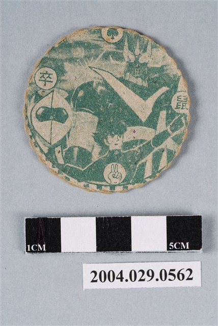 1.本物件為無敵鐵金剛尪仔標,呈圓扁狀,邊緣呈波浪狀,正面為紙質,中央圖案為第二代大魔神及第三代無敵戰神,大魔神發射金剛飛拳攻擊反派角色,正面上右下左各分別有「撲克牌-梅花」、「象」、「猜拳-布」、「帥」圖案與字樣,「象」為藍字,「象」為紅字;背面圖案為第二代大魔神,下方為主角國隆舉左手指向天空,左下則為主角國隆戴著頭盔及面罩,上右下左各分別有「撲克牌-黑桃」、「鼠」、「猜拳-剪刀」、「卒」圖案與字樣,整體僅有藍綠色一色。