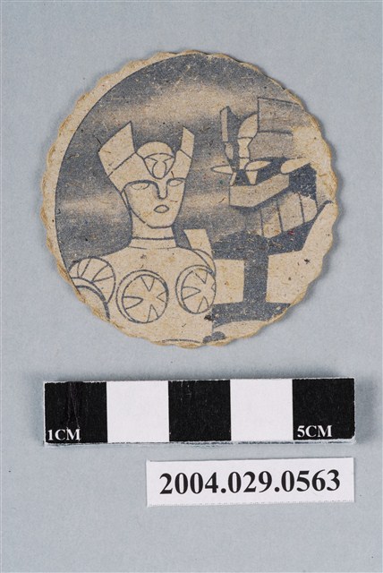 1.本物件為無敵鐵金剛尪仔標,呈圓扁狀,邊緣呈波浪狀,正面為紙質,中央圖案為帶著頭盔的國隆與博士,右下有「無敵鐵金鋼」藍色字樣,正面上右下左各分別有「撲克牌-黑桃」、「猜拳-剪刀」、「鼠」、「炮」圖案與字樣,「鼠」為藍字,「炮」為紅字;背面圖案為鐵金剛及木蘭號,整體僅有藍色一色。