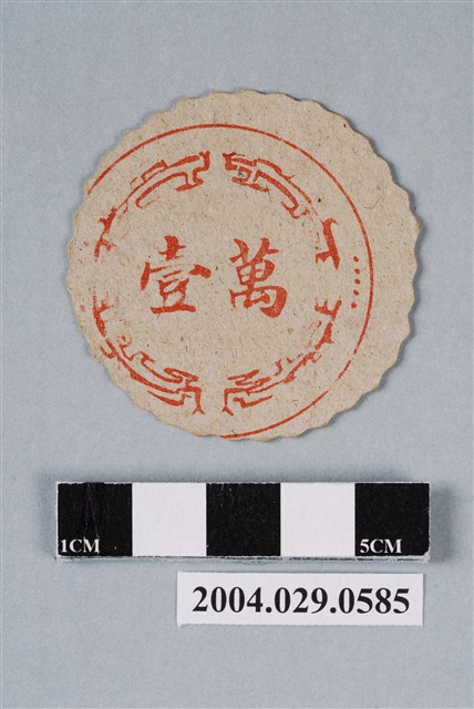 1.本物件為恐龍救生隊之恐龍與汽艇尪仔標,為圓形花邊紙質卡牌,圖案裁切不完整,正面圖案上下分別為卡通恐龍救生隊的恐龍與汽艇(潛水艇)虎鯊號(FreeMackerel),中央上方印有「恐龍」藍色字樣,由右上、右下、左下、左上各圖案與字樣分別是紅字「象棋-相」、「猜拳-石頭」、藍字「十二生肖-猪」、「撲克牌-黑桃」;背面圖案為紅色蓋印有圓圈內有裝飾之「壹萬」圖案及字樣。本件與登錄號2004.029.0584及2004.029.0586藏品相同。