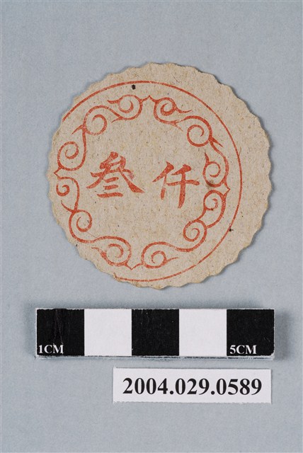 1.本物件為恐龍救生隊之怪獸尪仔標,為圓形花邊紙質卡牌,圖案裁切不完整,正面圖案上下分別為卡通恐龍救生隊的怪獸與(萬能號(BornFree),左上方印有「怪獸」藍色字樣,由右上、右下、左下、左上各圖案與字樣分別是紅字「象棋-帥」、「猜拳-剪刀」、藍字「十二生肖-牛」、「撲克牌-黑桃」;背面圖案為紅色蓋印有圓圈內有裝飾之「參仟」圖案及字樣。本件與登錄號2004.029.0587藏品相同。
