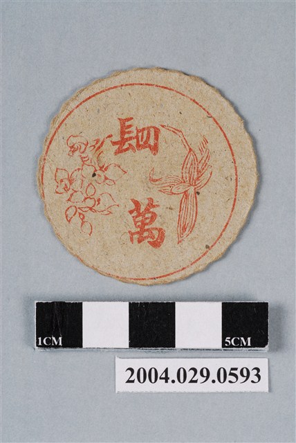 1.本物件為恐龍救生隊指揮塔尪仔標,呈圓扁狀,邊緣呈波浪狀,正面為紙質,中央圖案為動畫恐龍救生隊的指揮塔在攻擊恐龍,右上有翼手龍圖案,正面右方有「指揮塔」紅色字樣,正面上右下左各分別有「撲克牌-菱形」、「車」、「猜拳-剪刀」、「猴」圖案與字樣,「車」、「猴」皆為藍字;背面有為紅色錢幣圖樣,中央有「䦉萬」紅色字樣。本件與登錄號2004.029.0519、2004.029.0591、2004.029.0592、2004.029.0594、2004.029.0595藏品完全相同,並與2004.029.0604、2004.029.0605之正面圖案相同。