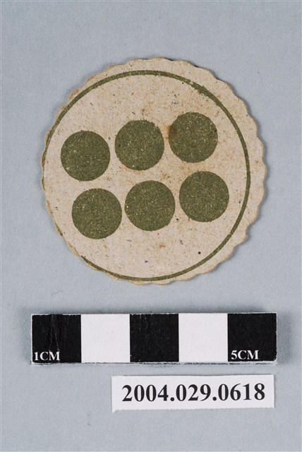 1.本物件為丁丁與平平尪仔標,為圓形花邊紙質卡牌,正面圖案右左兩邊分別為丁丁與平平,由上右下左各圖案與字樣分別是「撲克牌-黑桃」、藍字「十二生肖-虎」、紅字「象棋-相」、「猜拳-布」;背面圖案為黑色蓋印骰子之「6點」圖案。