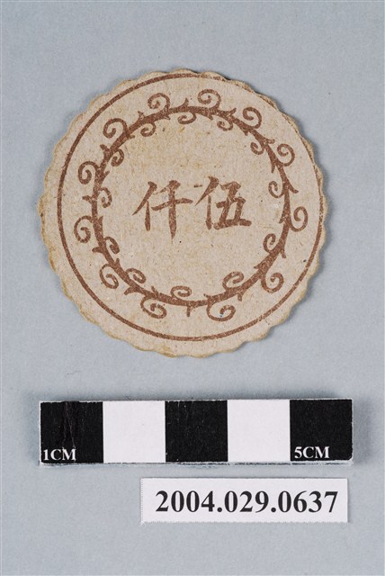 1.本物件為丁丁與平平尪仔標,為圓形花邊紙質卡牌,正面圖案右左兩邊分別為丁丁與平平,上方有藍字「丁丁平平」,由上右下左各圖案與字樣分別是「撲克牌-黑桃」、藍字「十二生肖-豬」、「猜拳-石頭」、紅字「象棋-傌」;背面圖案為黑色蓋印有圓圈內有裝飾之「伍仟」圖案及字樣。