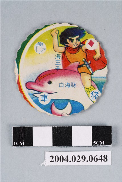 1.本物件為丁丁與平平尪仔標,為圓形花邊紙質卡牌,正面圖案為平平,右上有紅字「平平」,由上右下左各圖案與字樣分別是「撲克牌-菱形」、藍字「象棋-包」、藍字「十二生肖-豬」、「猜拳-布」;背面圖案為海王子與海豚露嘉,海王子為藍短髮,身穿橘衣,披有紅色披風,腰間配帶奧利漢短劍,騎乘於海豚露卡身上,露卡身體為粉紅色、白色,額頭有V字型圖案,背景為黃、白、藍漸層,畫面中央有藍字「海王子」、「白海豚」,正面右上、右下、左下、左上各圖案與字樣分別是「撲克牌-方塊」、藍字「十二生肖-豬」、藍字「象棋-車」、「猜拳-布」。